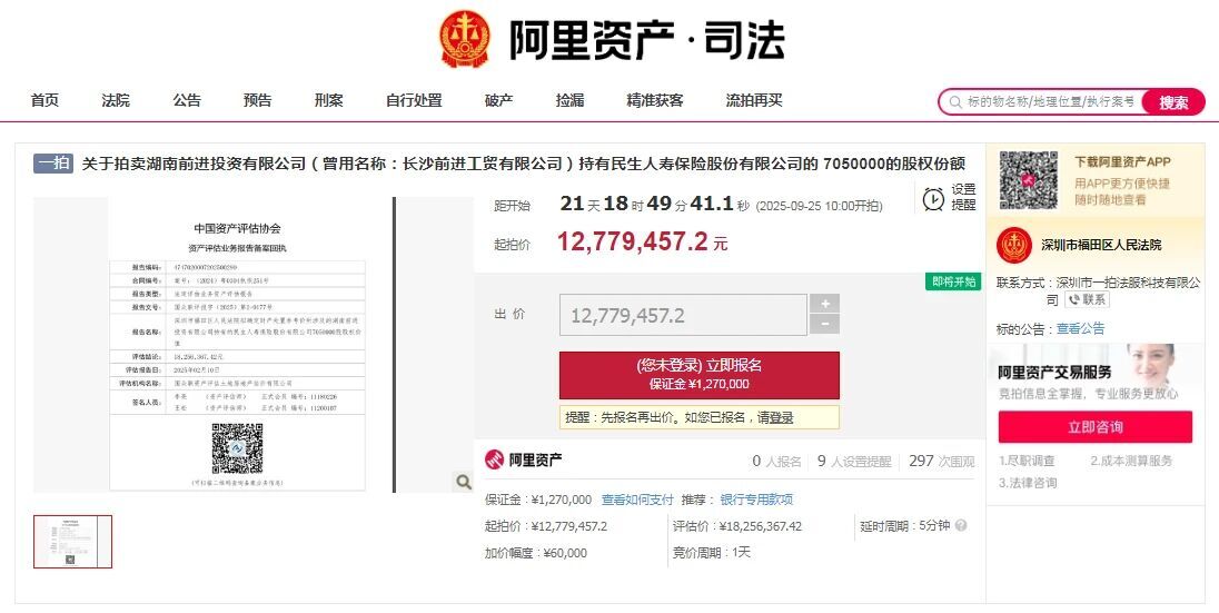 9月3日,《海外金融报》记者从阿里财富国法拍卖平台获悉,民生东说念主寿保障股份有限公司(下称“民生东说念主寿”)705万股股份将于9月25日公开拍卖,起拍价为1277.95万元,在评估价1825.64万元的基础上打了七折。